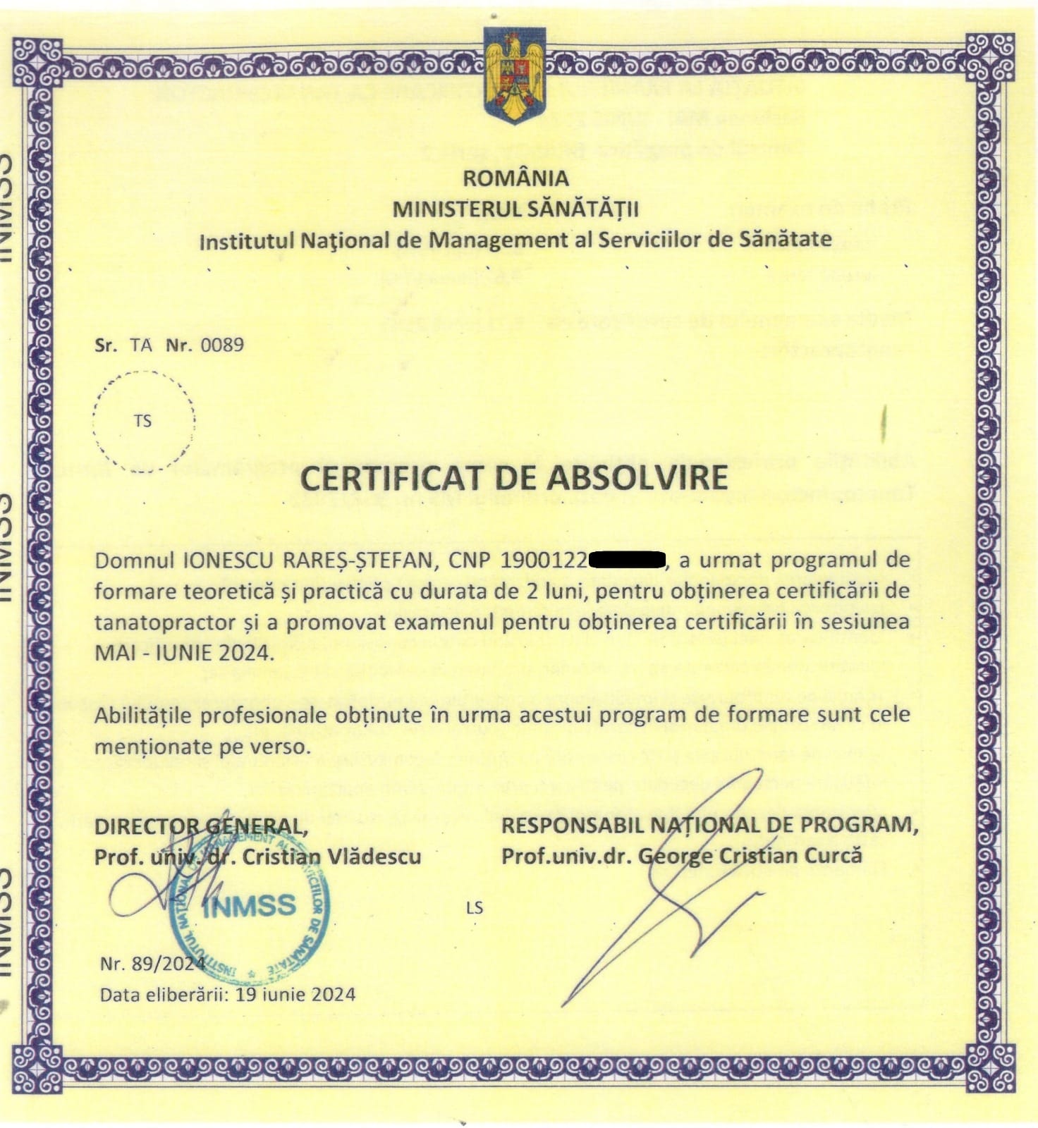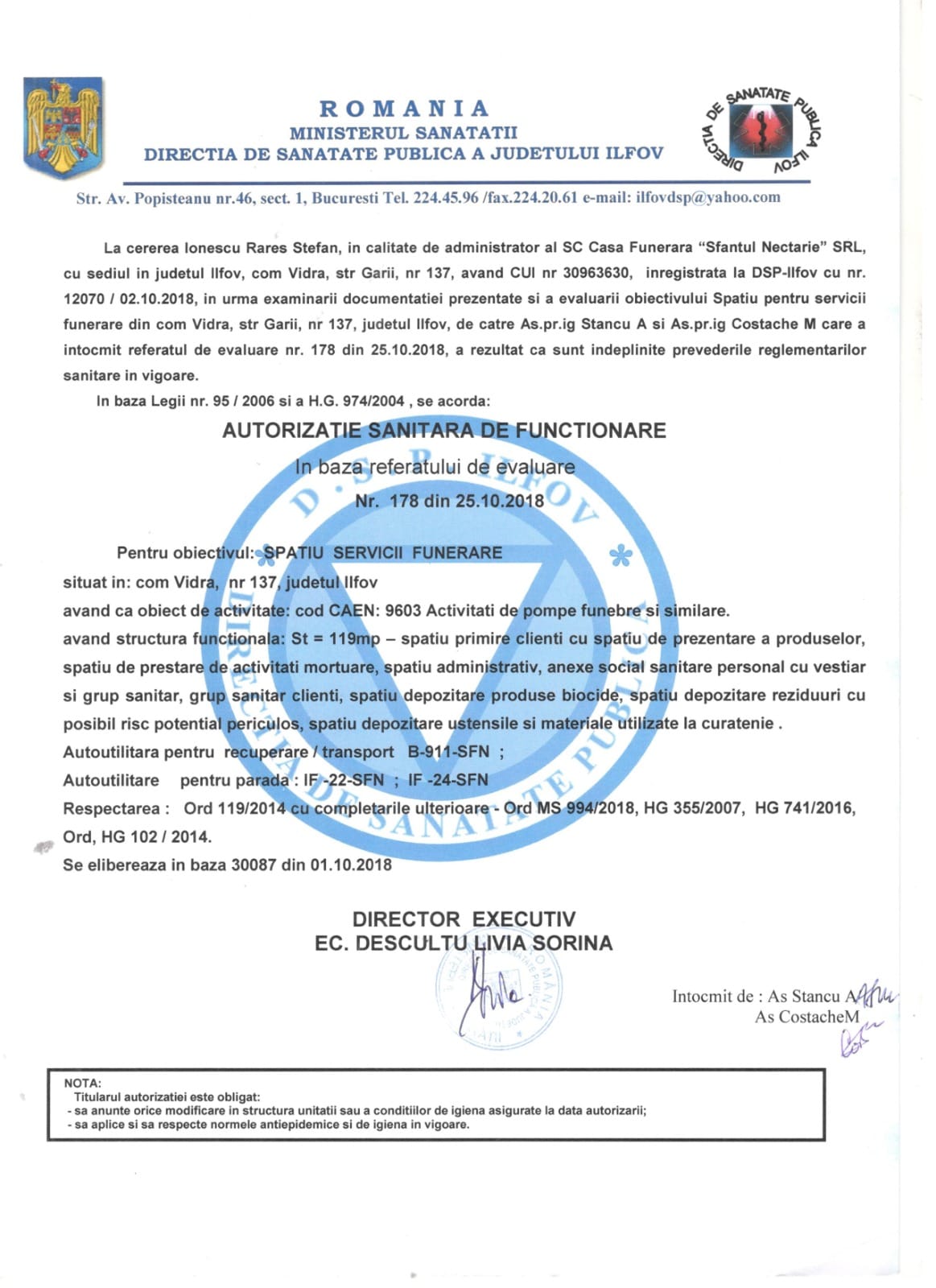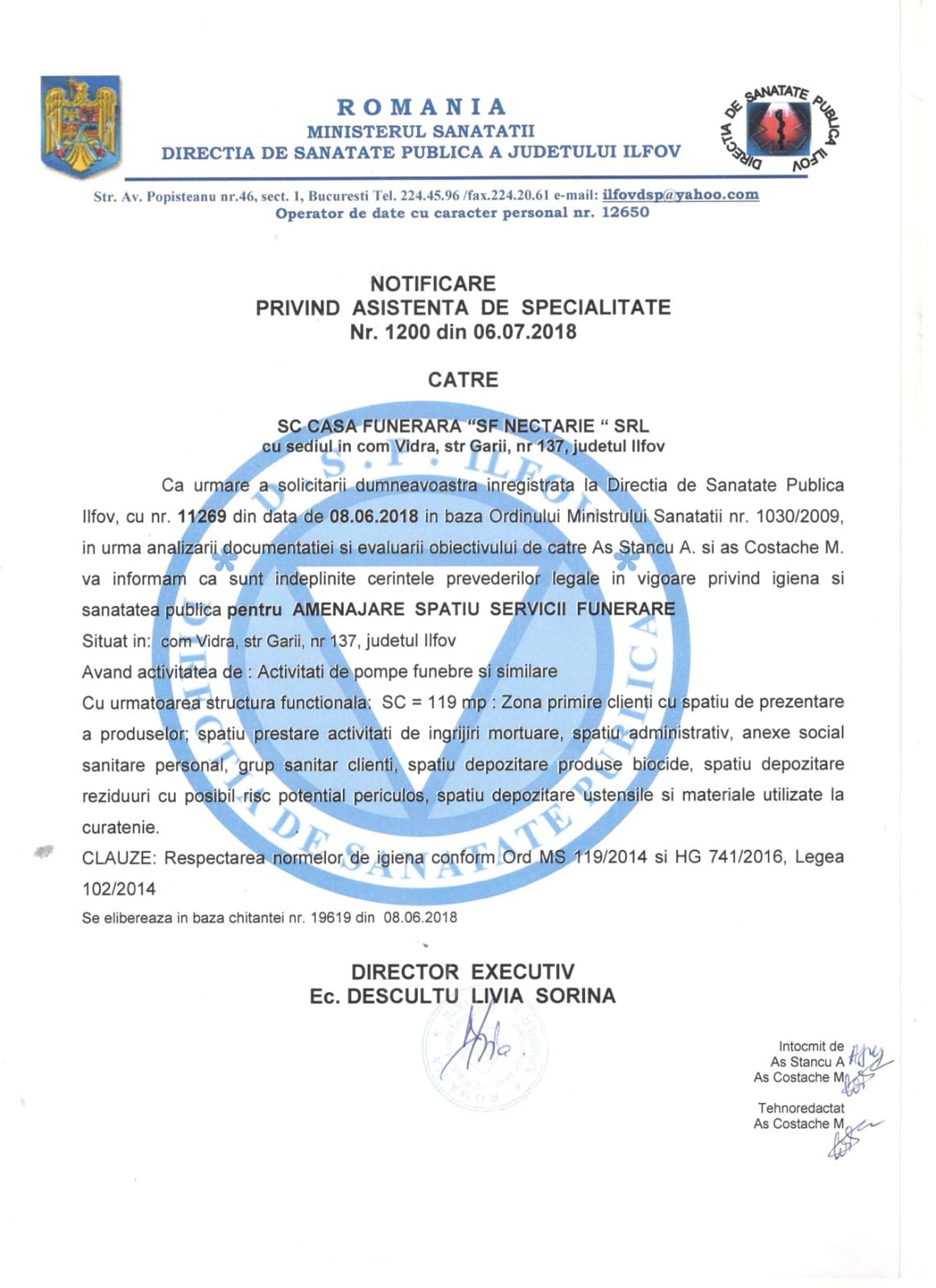 • Sală de pregătire cadaverică proprie, avizați D.S.P. și M.S. ca prestatori de tanatopraxie;